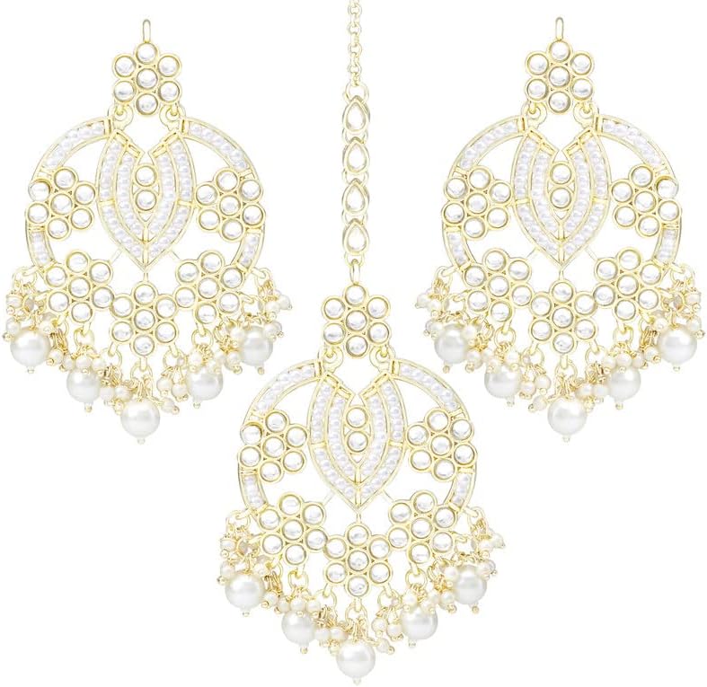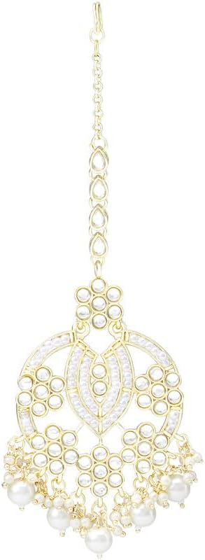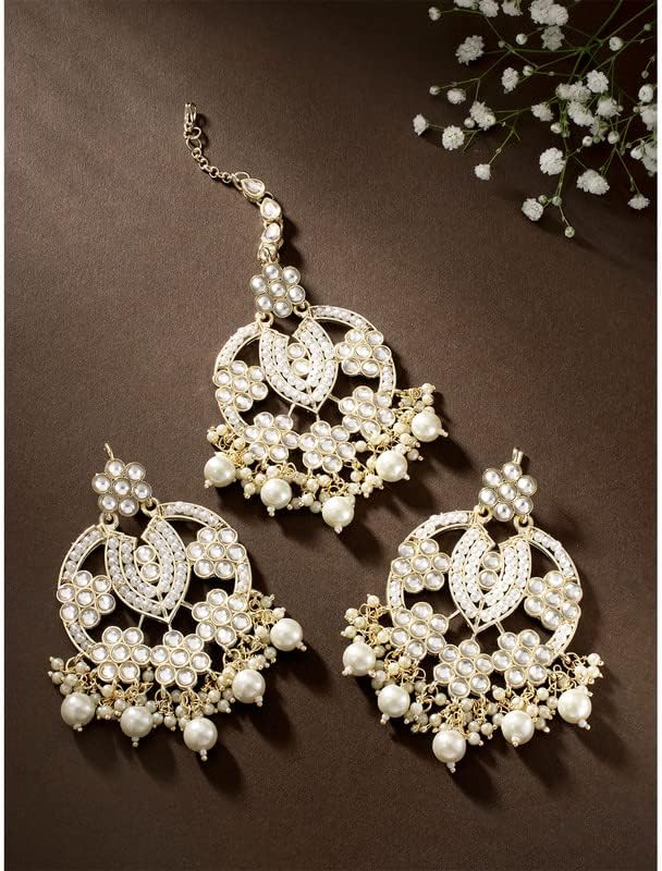 Aheli Gold Plated Kundan Pearl Studded Pear Shape Earring Maang Tikka Set Traditional Jewelry Gift for Women