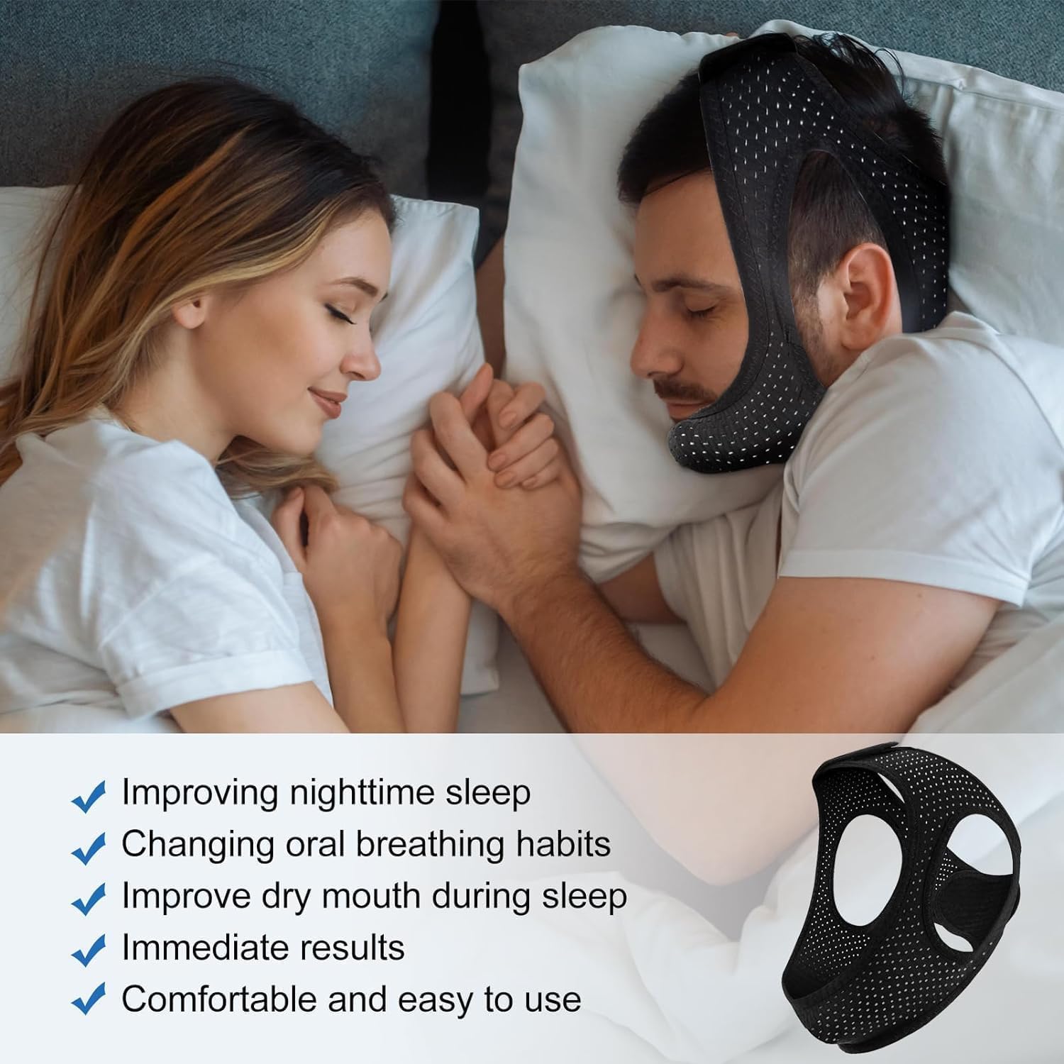 [Effortless Usage]: Simply wrap the chin strap around your head, adjusting the top and ear straps for a secure, comfortable fit. This ensures smooth breathing during sleep, promoting deeper, snore-free rest. Wake up refreshed and ready to tackle the day.