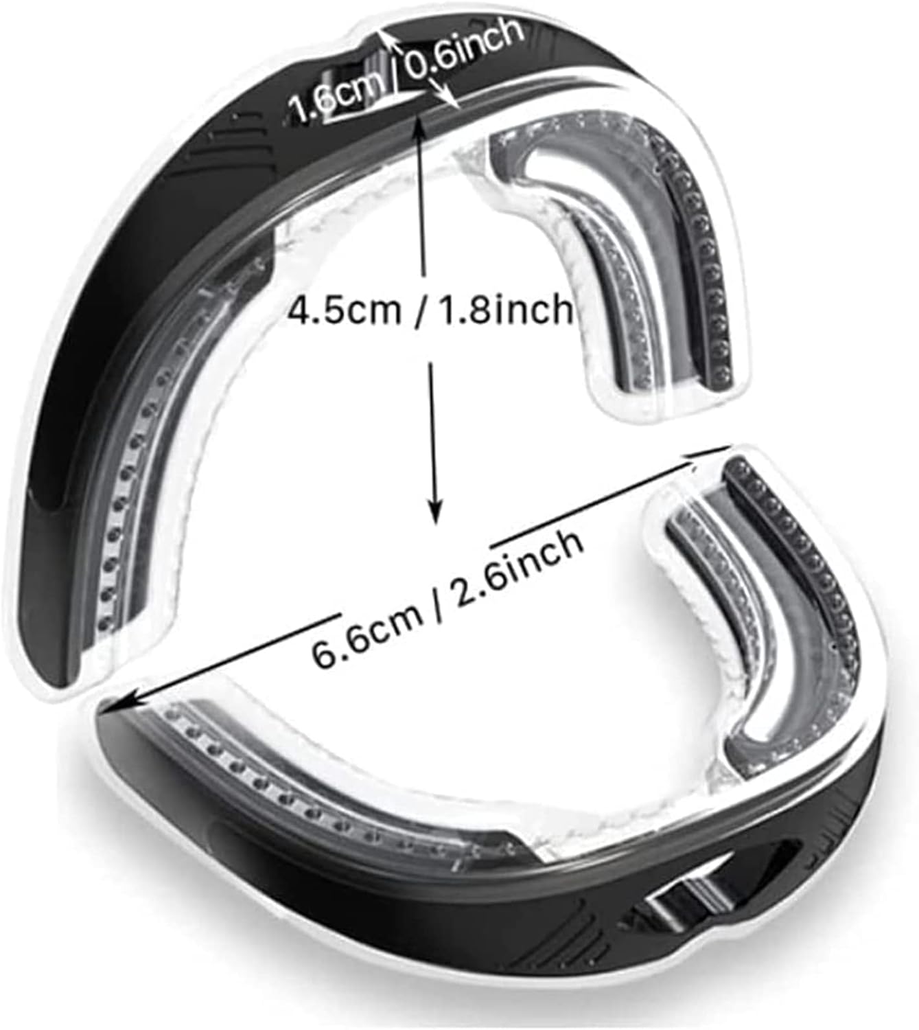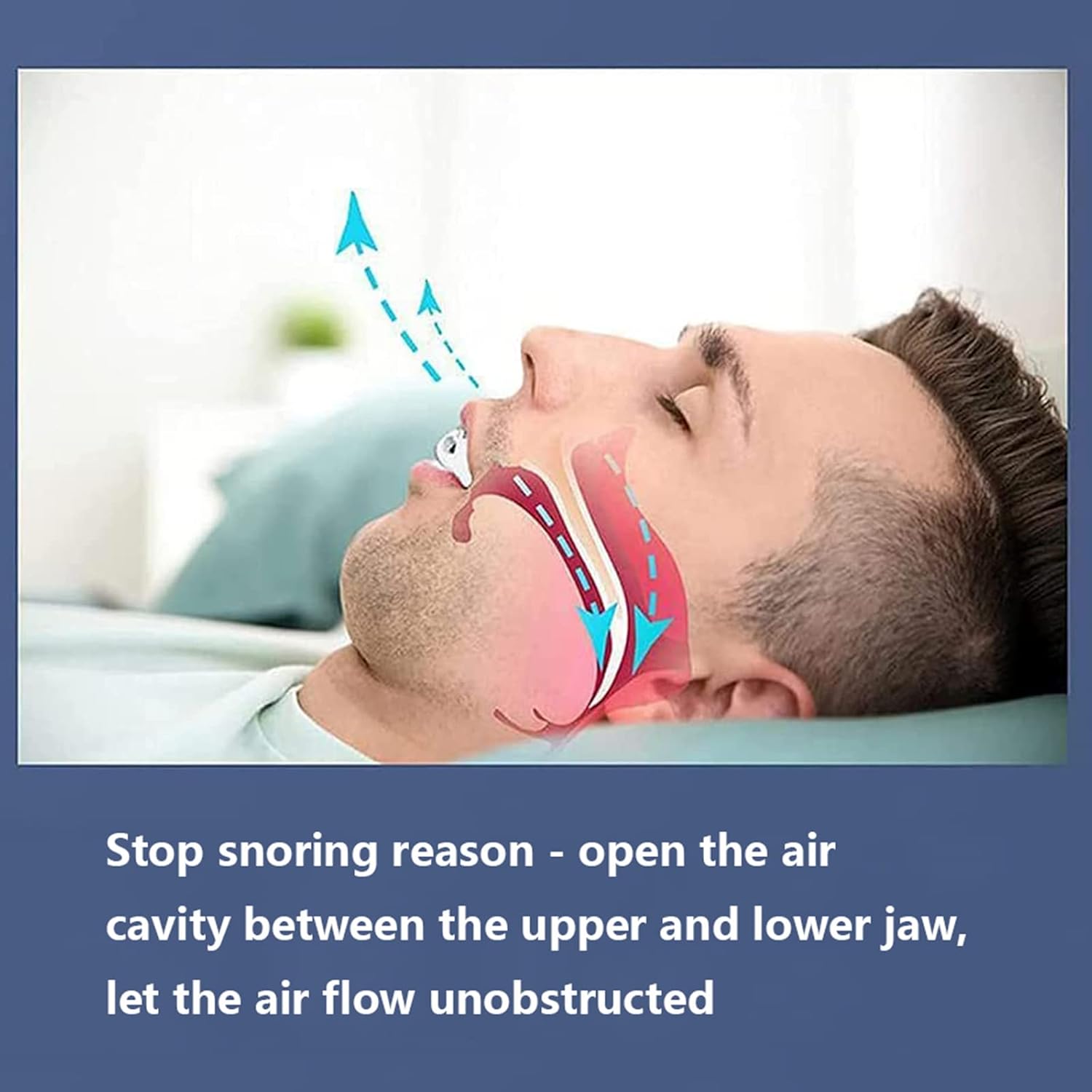 PRINCIPLE OF ACTION: Open the air cavity between the upper jaw and the lower jaw to make the air flow unblocked. Increase the vibration of the pharyngeal cavity and soft palate, and reduce the vortex. Allow the breathing to flow smoothly, thus relieving or eliminating snoring.