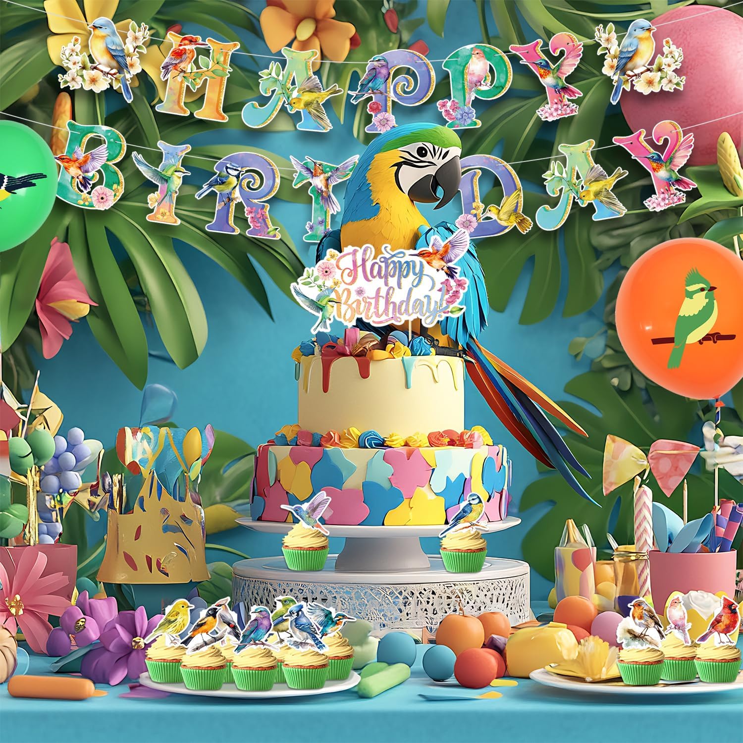 Bird Birthday Party Supplies: Includes 1 set of ‘HAPPY BIRTHDAY’ banner, 1* bird element pattern banner, 1 piece of bird cake topper, 3 bird honeycomb centerpieces, 12 pieces of bird cupcake toppers and 18 pieces of bird latex balloons, 2 set balloon ribbons and 40 * glue points in the package.