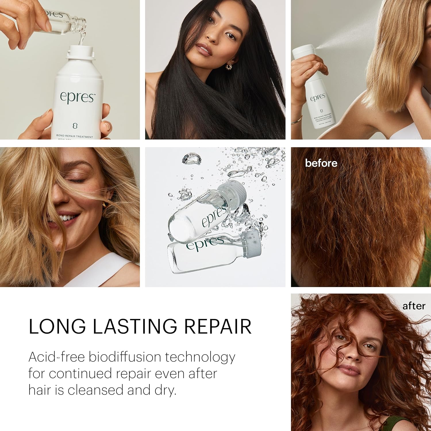 Epres Bond Repair Treatment’s highly concentrated, waterless formula consists of just four 100% vegan, biodegradable ingredients in a single, one-step solution that works in only 10 minutes to restore the health of damaged hair. Our patent-pending treatment will repair damage caused by chemical, thermal, or mechanical processes revealing your healthiest hair yet. It is safe for all hair types and colors of hair, including gray hair. At Epres, we use cutting-edge chemistry to create the most advanced formulas available. Developed by world-renowned material scientist, Eric Pressly, our revolutionary treatment is the future of high-performance hair care. Whether used at home or in the salon, epres’ one-step bond repair technology delivers professional-level, consistently superior results. The convenient reusable spray bottle and waterless refills, are more sustainable and better for the planet. Our starter kit includes a convenient spray bottle and two 15ml vials of concentrate that you mix with water and shake before use. Then spray on your hair and wait for 10 minutes. Using this treatment once or twice a week will give you softer, stronger, healthier hair.