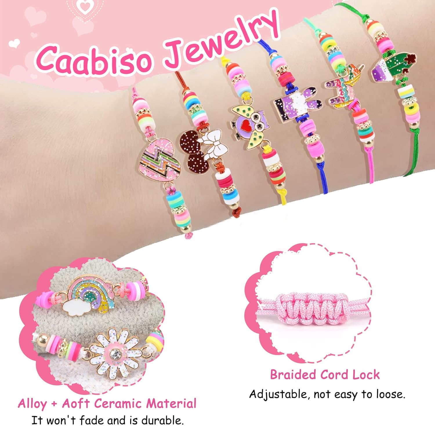 【LOVELY & WELL MADE】: They are made of exquisite oil-drip alloy pattern, braided string, soft pottery pieces, safe material. ⭕This girls bracelet set uses glitter design on the alloy charms, making the bracelet SPARKLE under the light. Easy to wear. Easy to care, no fading, durable, suitable for long-term use.