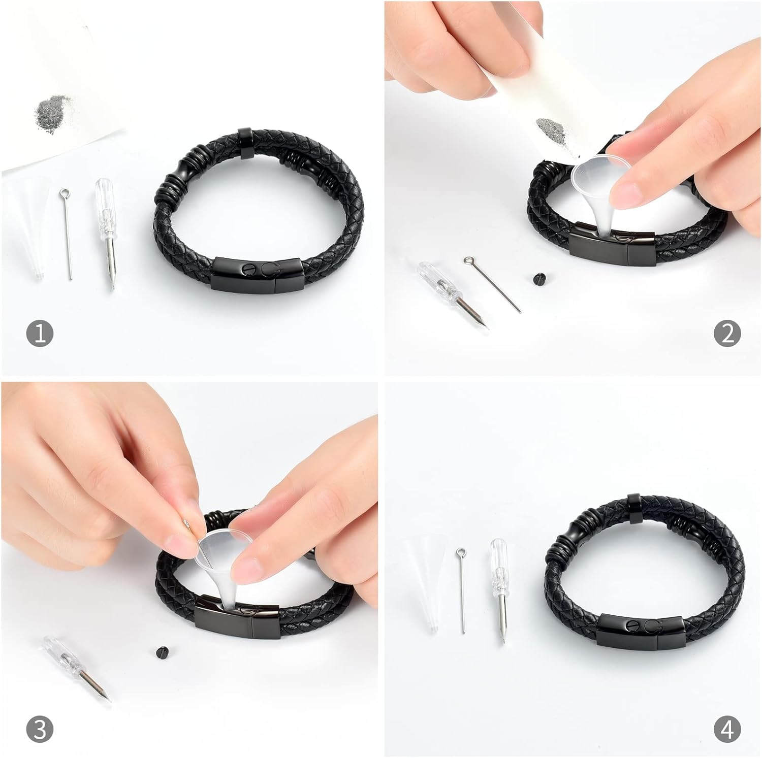 2. Pour the ashes into funnel,stainless steel pin can help guide the remains into the bracelet.