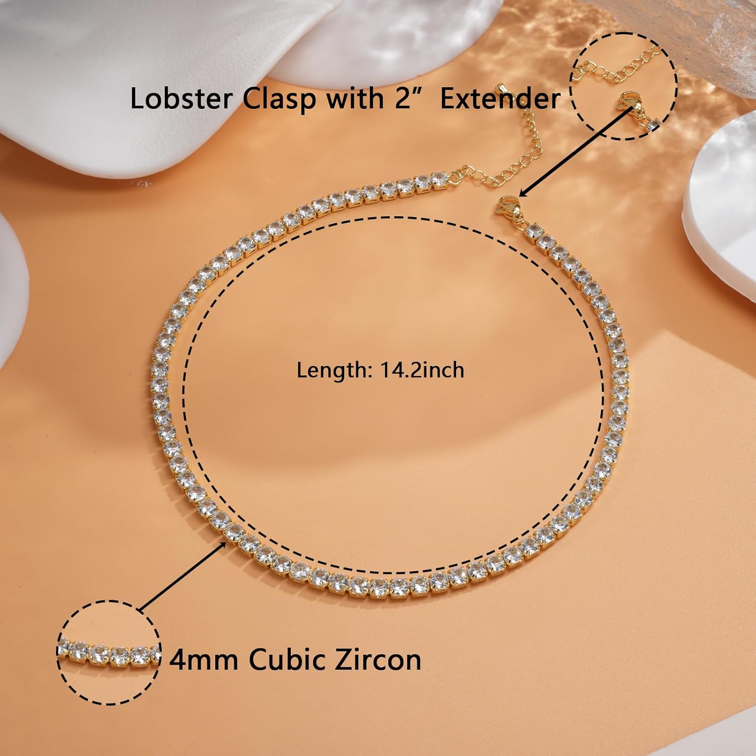 A Dainty Masterpiece: Subtle yet captivating, this gold necklace women is the perfect balance of elegance and simplicity.A Fit That’s Just Right: With its adjustable 2-inch extender chain, this piece can be worn as a chic choker necklace for women or tailored to your ideal length.Luxurious Craftsmanship: Designed from copper and cubic zirconia, plated in either gold or silver for a lasting, brilliant shine.Effortless Layering: This tennis necklace pairs beautifully with other dainty gold necklace styles, perfect for layering to create a personalized look.