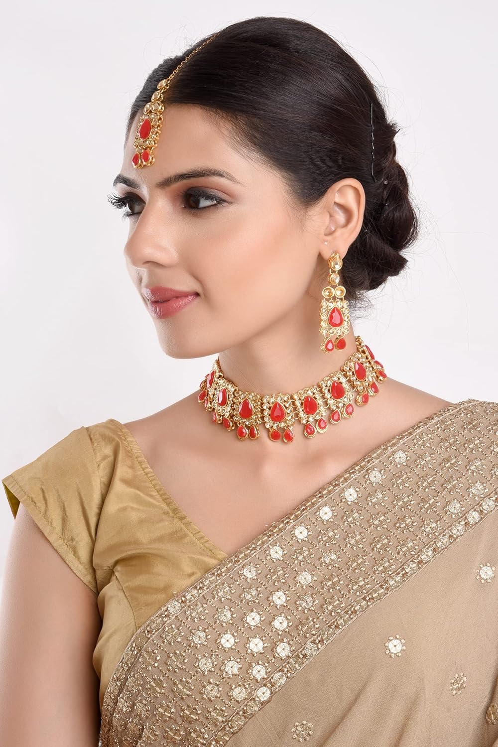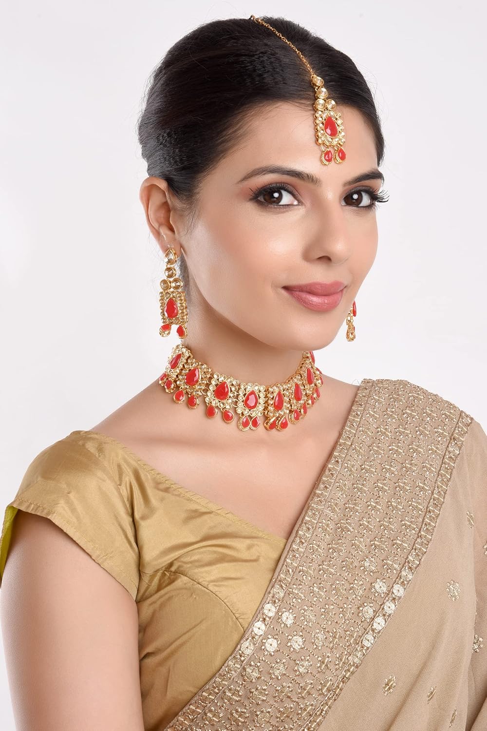 Traditional, vintage, boho, ethnic, elegant statement chocker necklace earrings maangtikka head chain fashion novelty wedding bridal Indian jewelry set costume accessories for women, brides and bridesmaid. Delicate eye catching classic unique exotic jwellery. Traditional Royal Setting Style Of India Used By Mughal Emperors and Kings In Rajasthan. Embellished with rhinestones, kundan, crystals, beads, stones and faux pearls. Skin Friendly, environmental friendly. Durablility with the look of fine premium quality jewellery. Wear this with your gorgeous traditional dress, saree, lehenga, gown on any wedding, party, engagement, ring ceremony, prom, anniversary or any festive or special occasion. Perfect Gift For Any Occasion for yourself or your loved ones, GIFT FOR HER! Ideal Valentine’s, Birthday, Anniversary gift for wife or girl friend . CARE INSTRUCTIONS: Avoid contact with heat, chemicals and water. Clean with dry cotton cloth. Pack in an air tight container/ pouch after use. It is advisable to wear the jewellery after makeup.