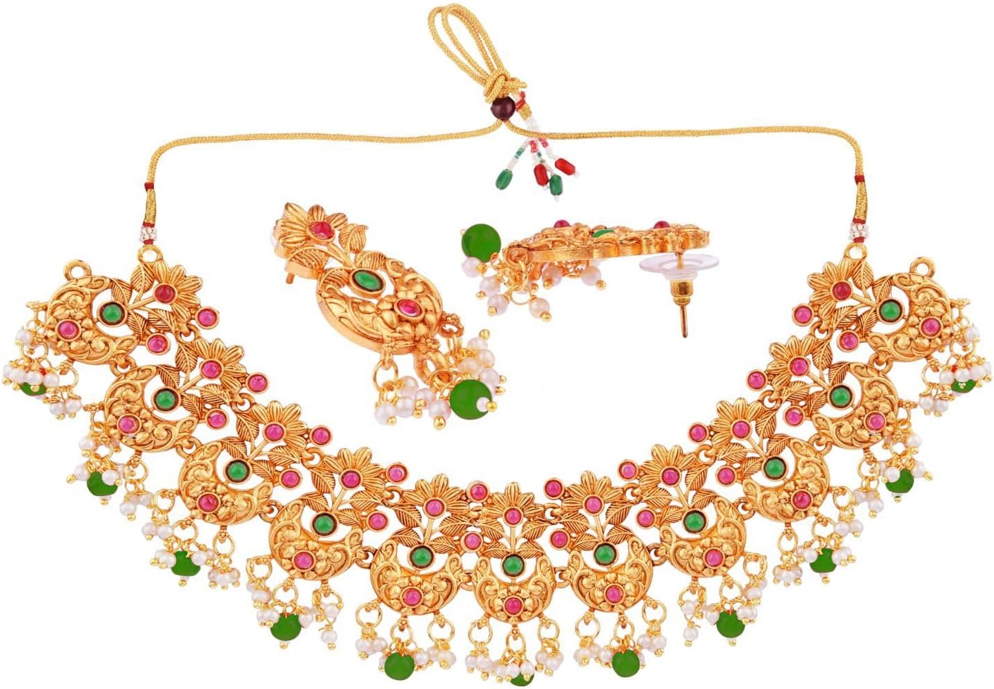 This exquisite and elegant gold plated Indian jewelry set, choker necklace earrings bridal jewelry set costume accessories for women and brides adds a traditional cum contemporary touch to your ensembles Embellished with crystal stones, faux pearls and crystal floral pattern, a classic fusion of exquisite craftsmanship and feminine elegance. This antique look jewelry goes with everything in your closet from ethnic outfit like saree, lehenga, gowns, suits on any wedding, party, engagement, ring ceremony, prom, anniversary or any festive or special occasion or as fashion novelty costume jewelry. These statement jewelry can be wear on occasion of Wedding, Sangeet, Engagement, Dance Performance, Dandia Nights, Garba and the Festivals like, Diwali, Eid, Rakshabandhan, Navratri, Durga Pooja, Holi or any special occasions and moment of your life. Elegant gift jewelry for yourself and your loved ones, like, Mother, Daugther, Girl Friend, Wife, Fiance, Grand Mother, Sister – Sister in law, Aunt, Neighbour. Ideal Valentine’s, Birthday, Anniversary, mother’s day, women’s day, gift for wife or girlfriend