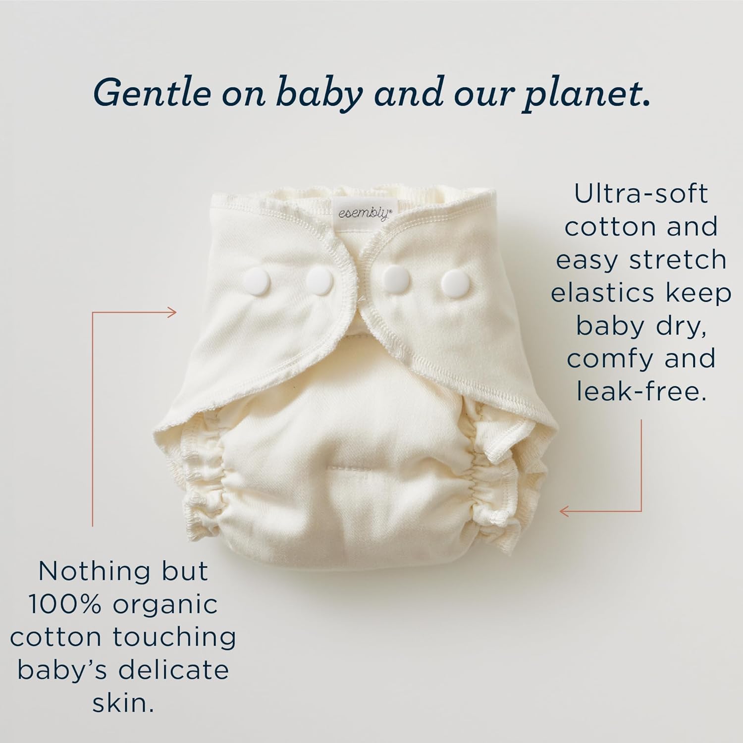 ABSORBENT AND WATERPROOF: The Esembly Cloth Diapering Bundle includes three ultra-absorbent organic cotton Inners and one recycled waterproof Outer. The Esembly diaper is made of 2 parts, the Inner provides the absorbency, and the Outer layers over the Inner to complete the diaper. Esembly Cloth Diapers come in two trim-fitting sizes: Size 1 (7-17lbs) and Size 2 (18-35lbs) to take your baby from birth to potty training.