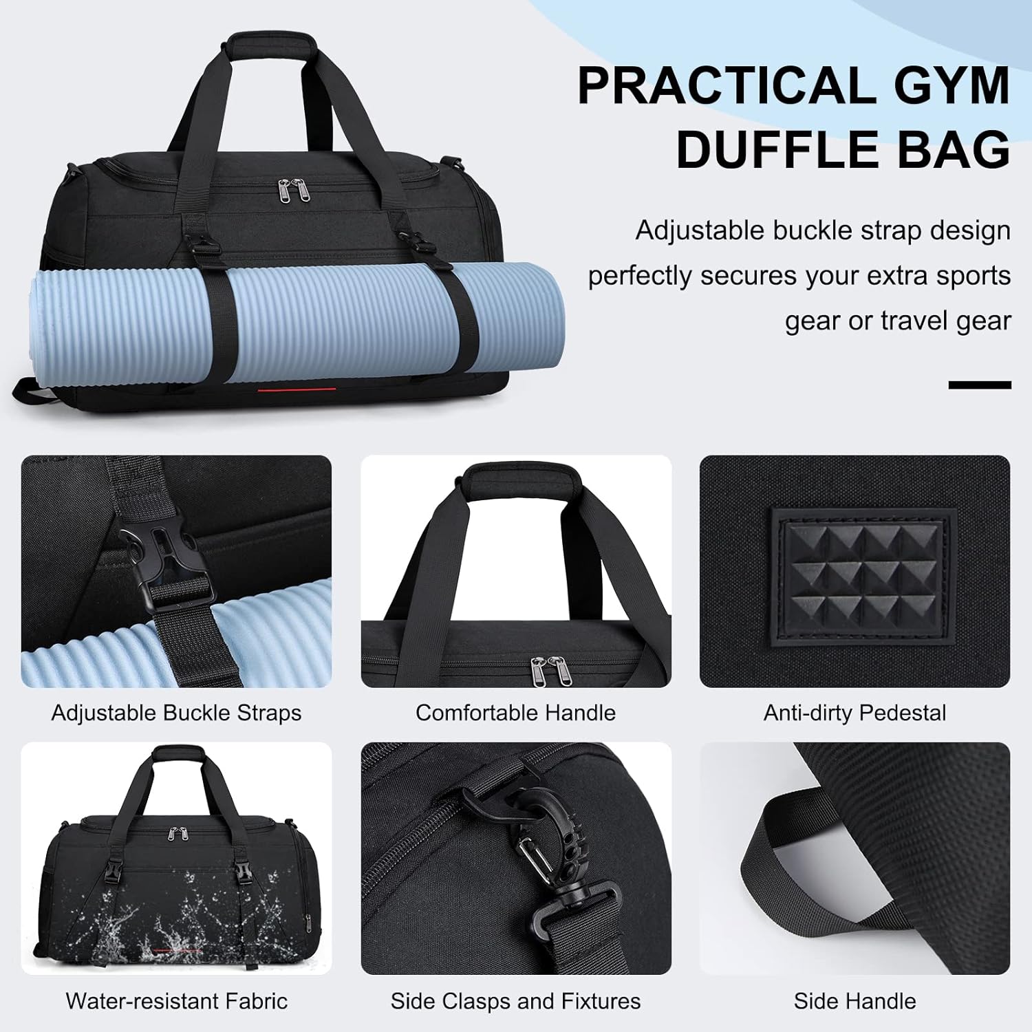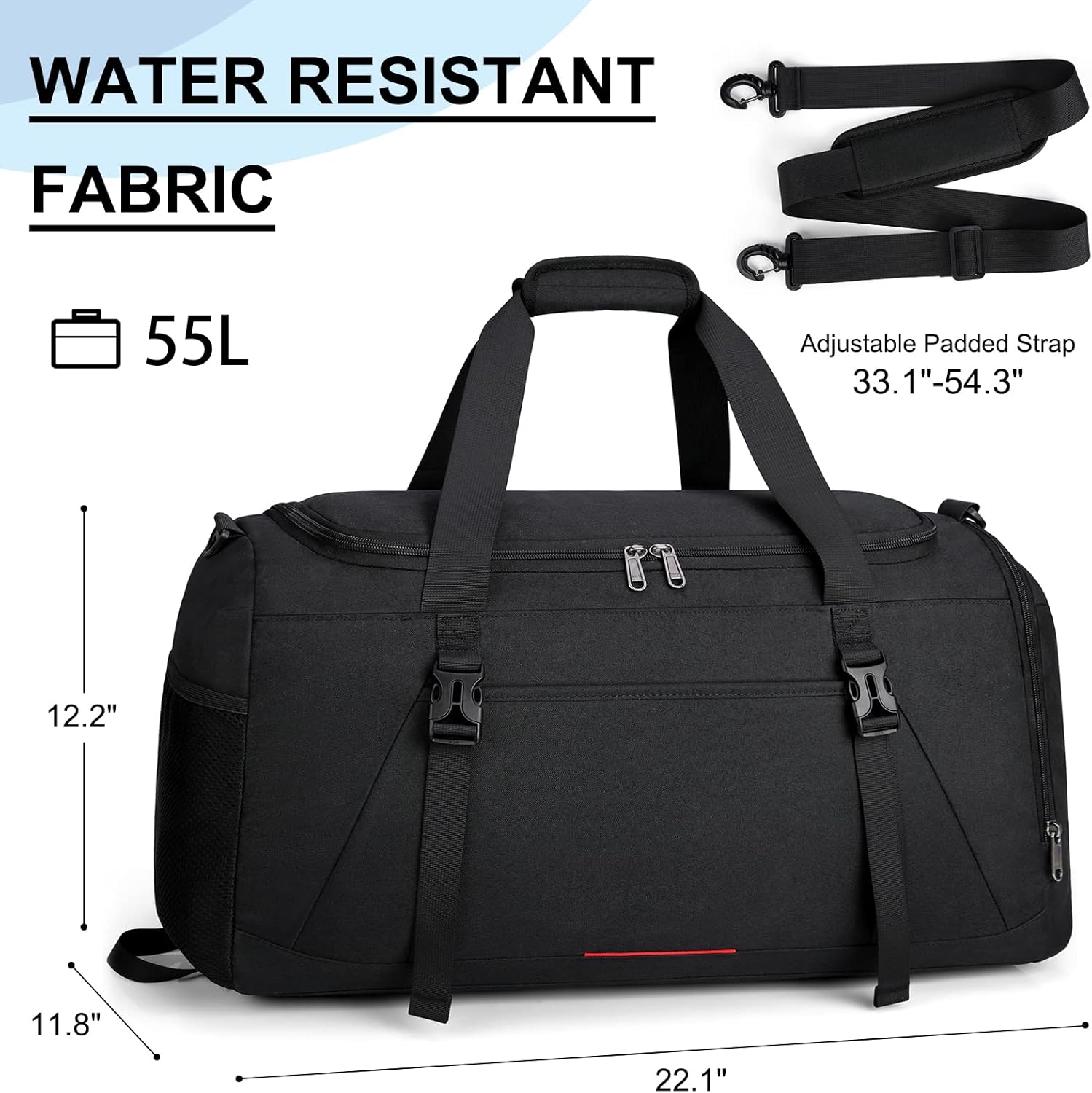 【Multi-purpose Gym Bag】Gym bag for men has two sizes are available (40L measured: 20.5*11.1*11.1 inches, weight: 2.6 lbs; 55L measured: 22.1*11.8*12.2 inches, weight: 3.13 lbs). Equipped with a removable and adjustable padded shoulder strap and double handles with padded, make the gym bag can be used as a carry on bag, crossbody bag and shoulder bag. Moreover, it can serve as a duffle bag men, weekender and overnight bag or sports bag for fitness, camping, travel, school or business trip.