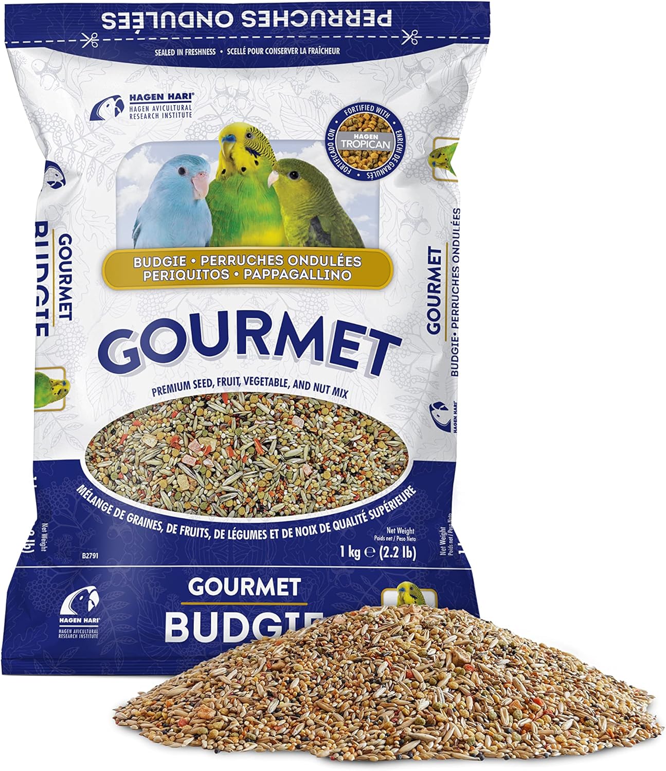 Hagen Gourmet Seed Mix for Budgies contains only the highest quality seeds, dried fruit, and legumes blended in a perfect balance. Specially formulated for the nutritional needs of all budgies, the seeds are carefully selected for high nutrition and taste appeal. The seeds are air cleaned and then polished, producing a dust-free and appetizing mix eagerly sought by budgies. The seed mix is supplemented with essential vitamins and minerals to ensure the finest possible nutrition for birds. Gourmet Seed Mix comes in a convenient re-sealable bag for freshness. 1 kg (2.2 lbs).