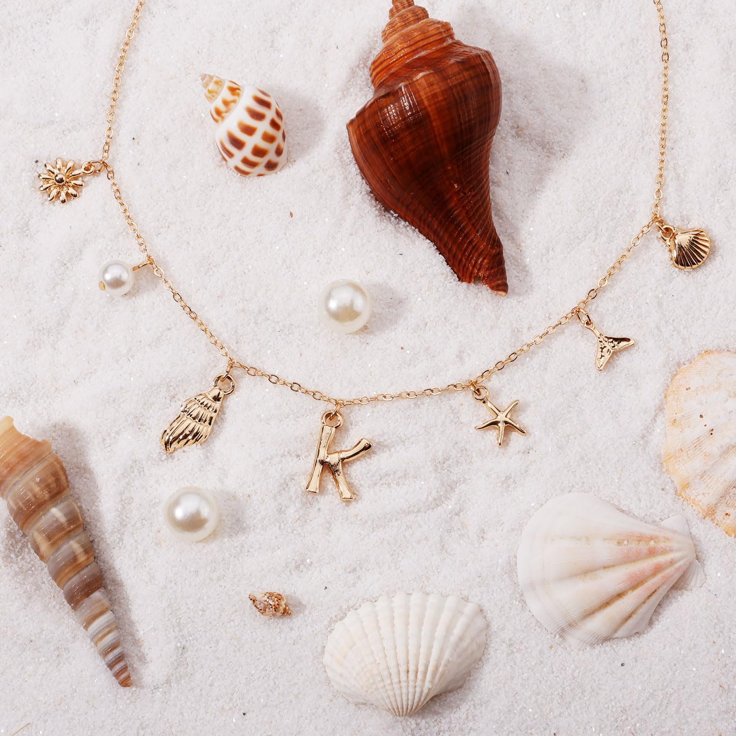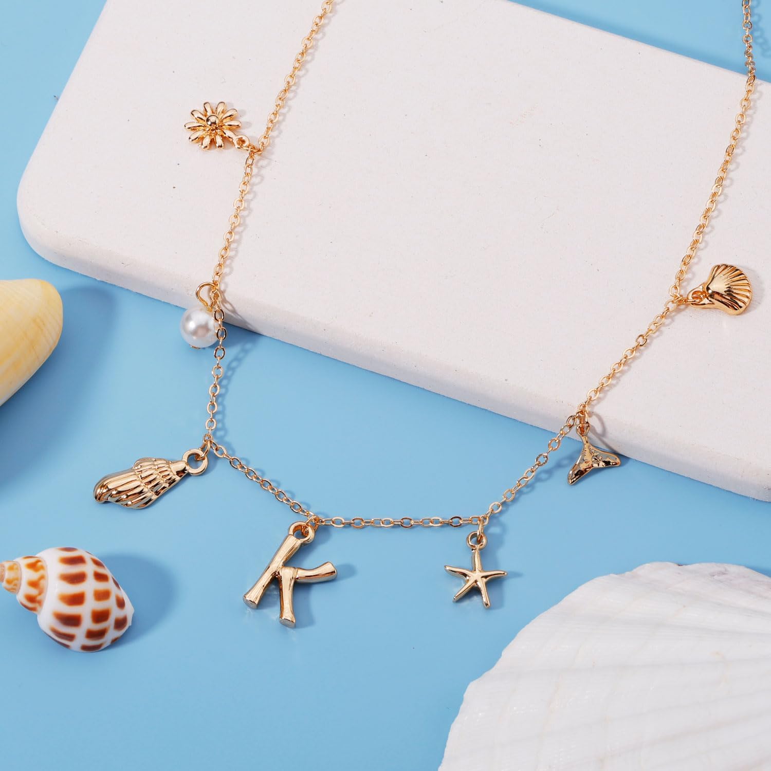 Initial Charm Necklace for Women, Gold Shell Letter Necklace, Seashell Starfish A-Z Alphabet Pendant Name Boho Summer Beach Jewelry Gift for Lady Girl Teen