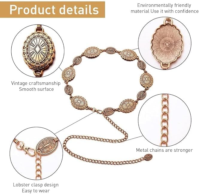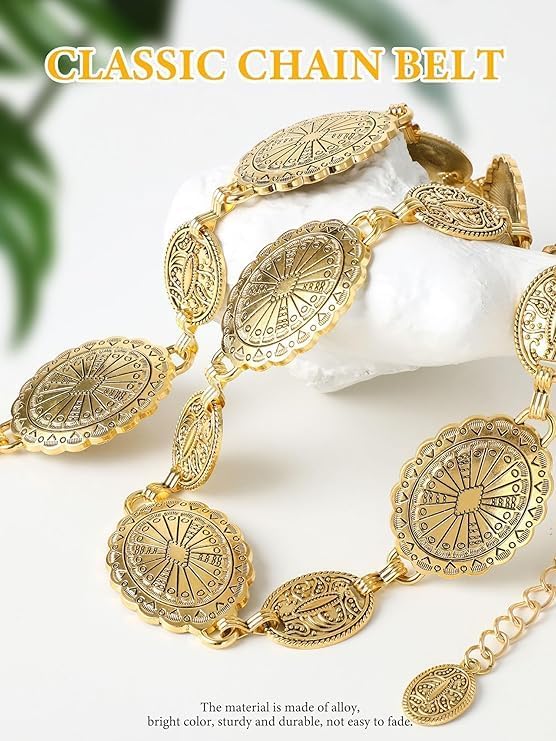 Crafted from high-quality metal, this concho belt is designed to stand the test of time. The durable material ensures that the belt remains a fashion statement in your wardrobe without losing its luster or structural integrity. The fine golden touch that adorns each disk adds an extra layer of elegance, making the belt both stylish and robust. Whether you wear it daily or on special occasions, this concho belt promises to retain its beauty and functionality.