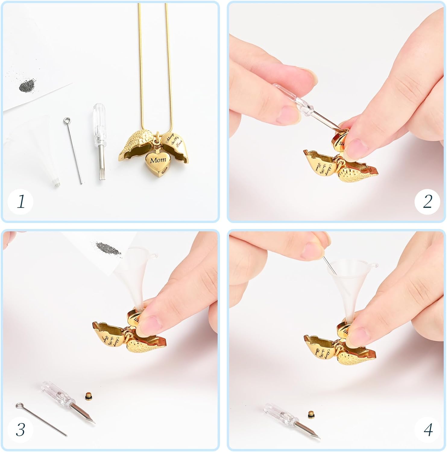It is not only an ashes necklace, but also a souvenir. You can place a small amount of ashes, including human ashes, pet’s ashes, dog/cat ashes, a lock of hair, a pinch of burial soil, or dried memorial flowers, etc. Fill it with anything that reminds you of someone or something special, this ashes necklace is perfect to memorialize your beloved forever and keep your loved one close to your heart at all times.