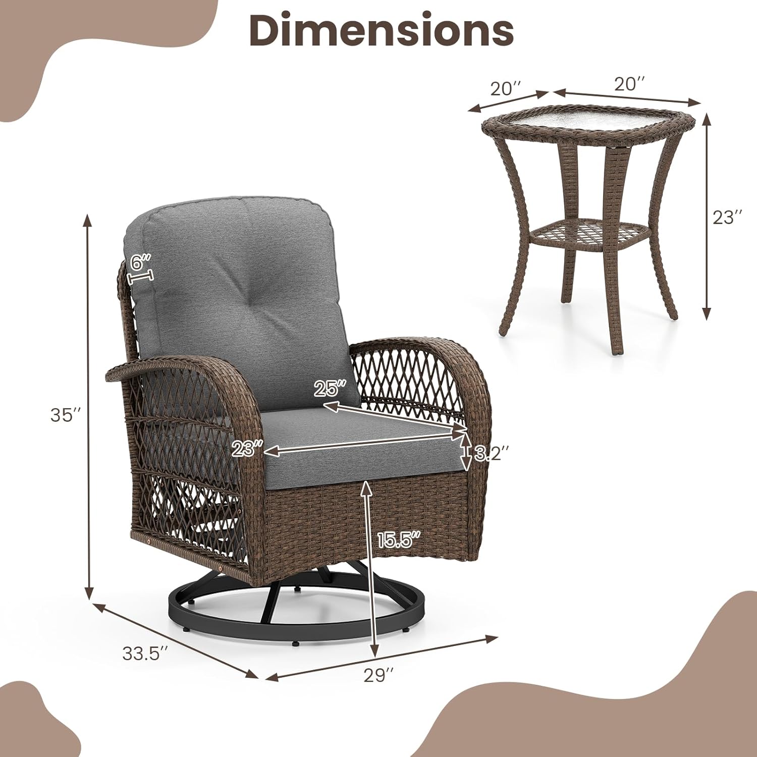 Robust PE Rattan Construction: Made from high-quality mix brown PE rattan, this 3-piece wicker swivel rocking chair set resists fading and damage, ensuring long-lasting beauty and durability in any outdoor setting.