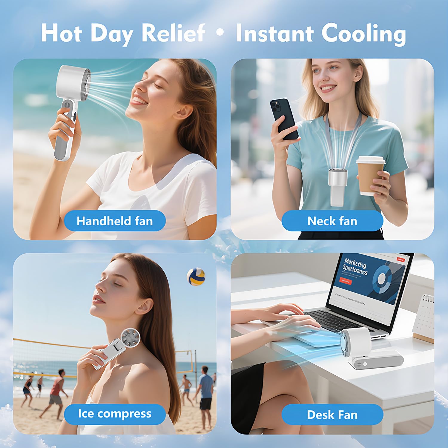 【3-in-1 Cooling Fan】Experience ultimate flexibility with our multi-functional personal fan that effortlessly transforms between handheld, desktop, and wearable modes. The included lanyard allows for convenient neck wear, while its ultra-compact body (just 195g) slips easily into bags for on-the-go comfort. Perfect for professionals, travelers, and outdoor enthusiasts, this whisper-quiet fan provides instant relief during office work, commutes, travel, or daily activities – adapting seamlessly to your lifestyle