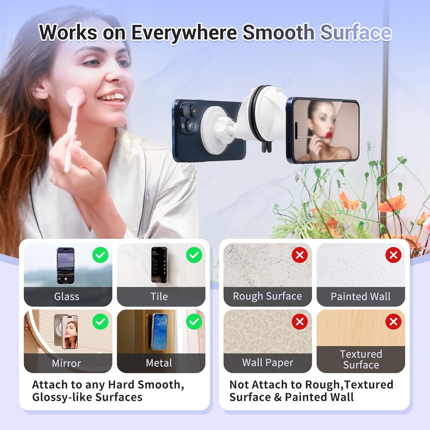 Can mount your phone to any smooth, glossy-like surfaces such as mirror, glass, window, metal, plastic, marble, tile, kitchen, etc.