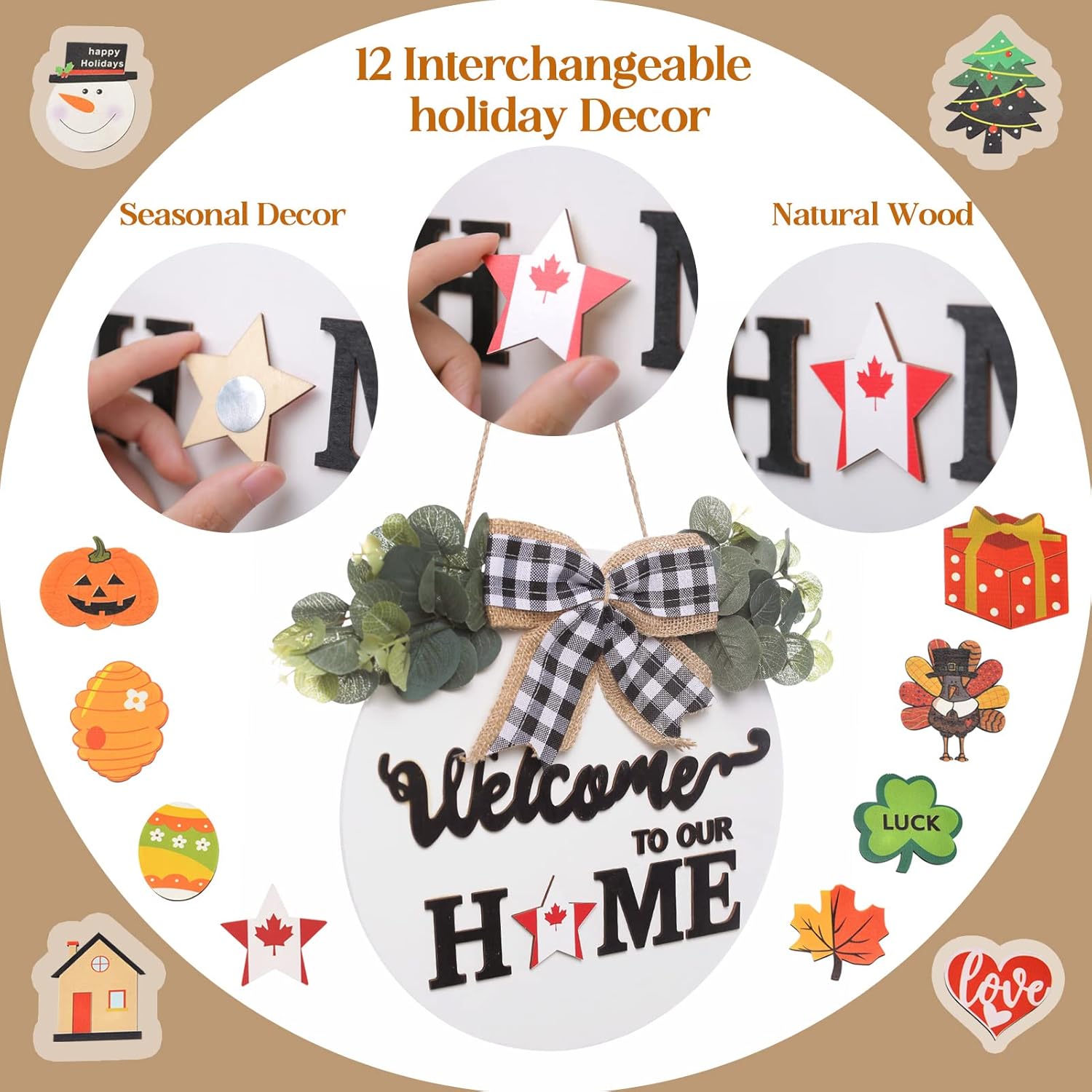 ✅【MULTI TOPIC USE】Our front door welcome sign can be a patriotic decorations or ornament to complement other decorations. our wooden wreaths can also be used for Valentines Day, Easter, fall decor for home,harvest day, Halloween, Christmas and other festivals. We can switch scenes according to different Holiday and use one thing for many purposes! There are totally 12 interchangeable seasonal signs.