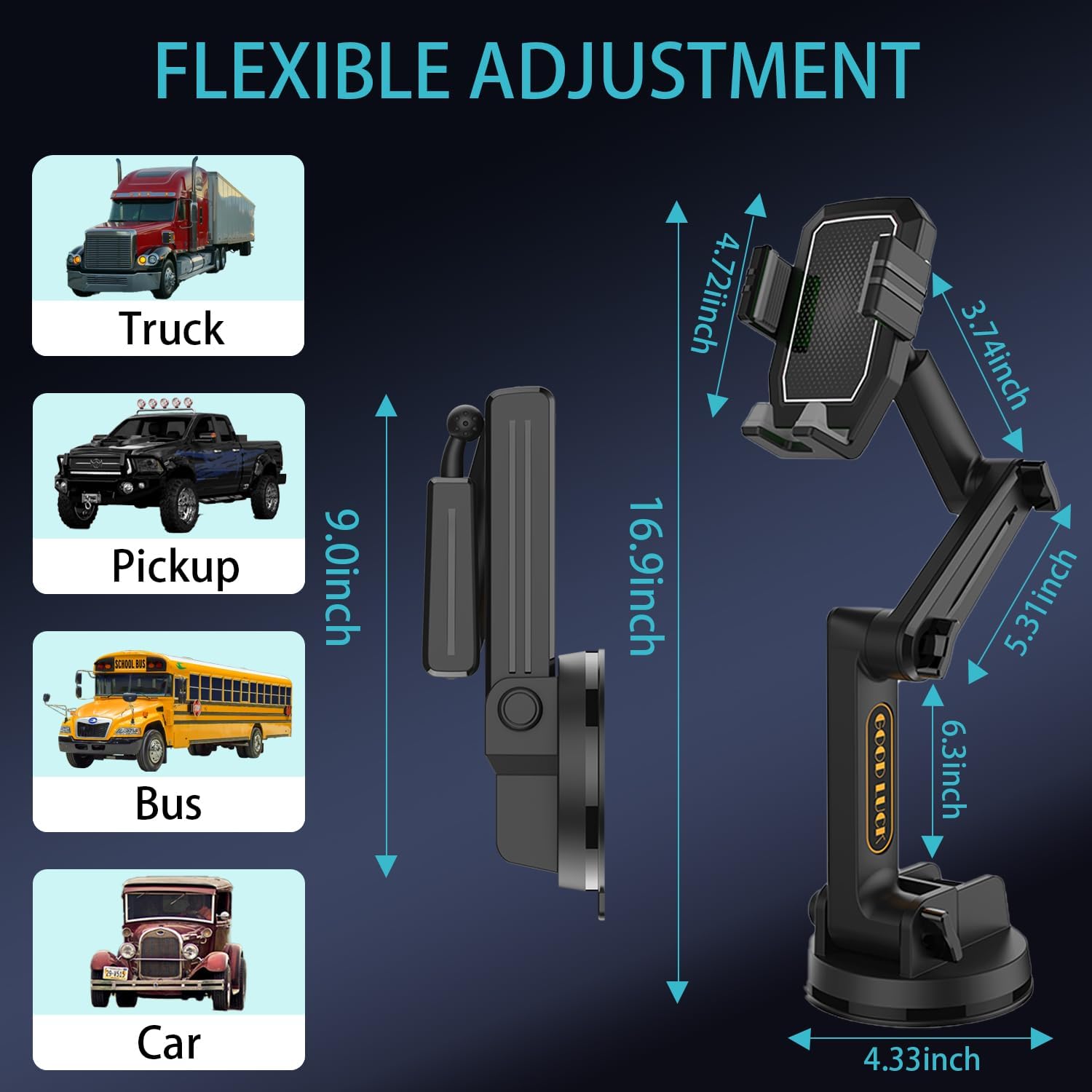 Mount Anywhere, Conquer Everywhere: This ain’t your average truck phone holder. Made for the kings of the road – truckers. Stick this phone truck mount on your big rig’s dashboard or windshield, and it’s staying put. No gimmicks, no slippin’, just a solid grip. Tackle those turns, slam on those brakes, or hit those rough roads – your phone ain’t budging.