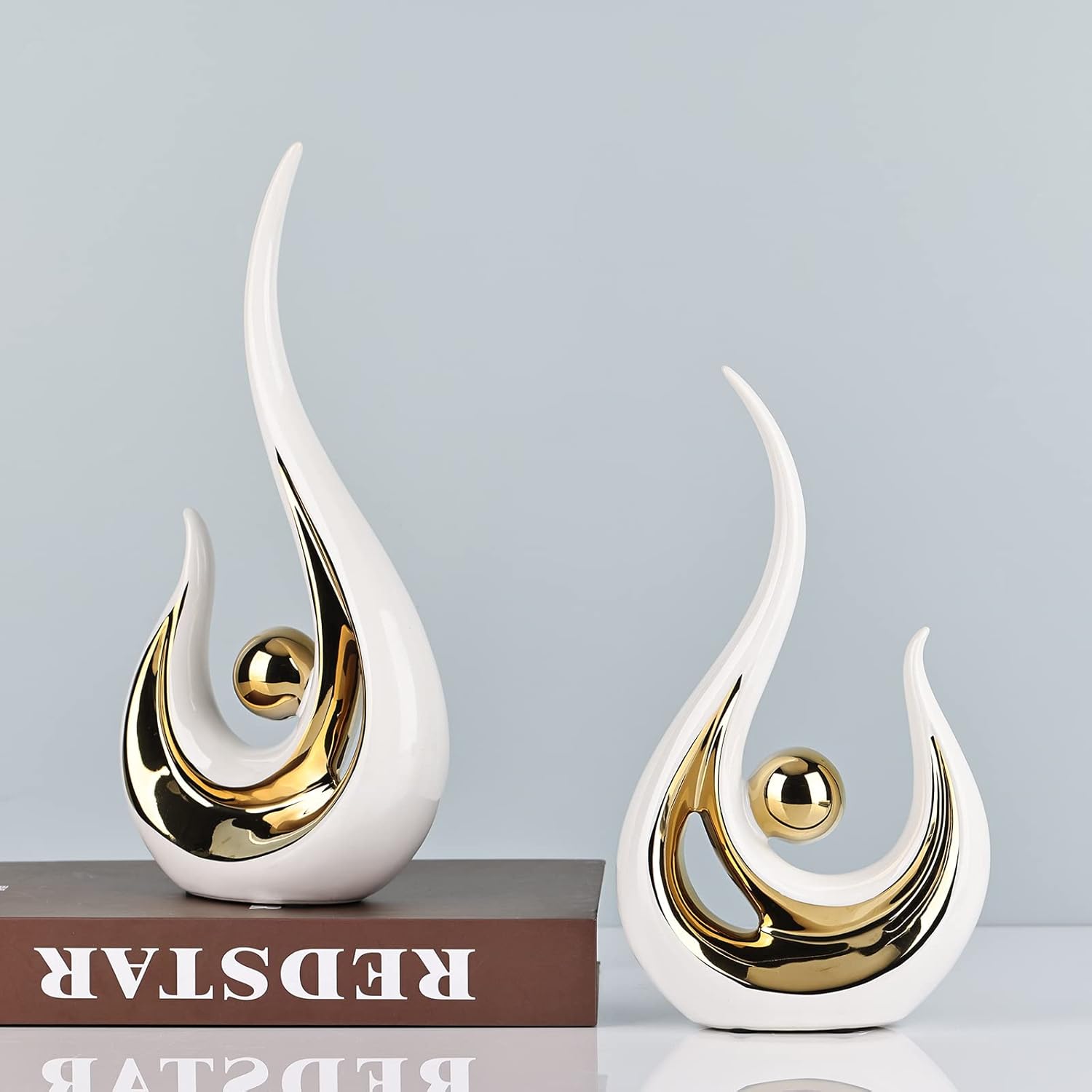 【Bookshelf Decorative Objects】 Beautiful and eye-catching of White and gold Art Statue, presenting the beauty of modern art, the whole is electroplated and polished to present a mirror effect, never fading, Placed in a corner, it shall immediately attracts the attention of your guests. Artistic figurines will be your Perfect Center pieces decoration for table, for living room White and gold decorations