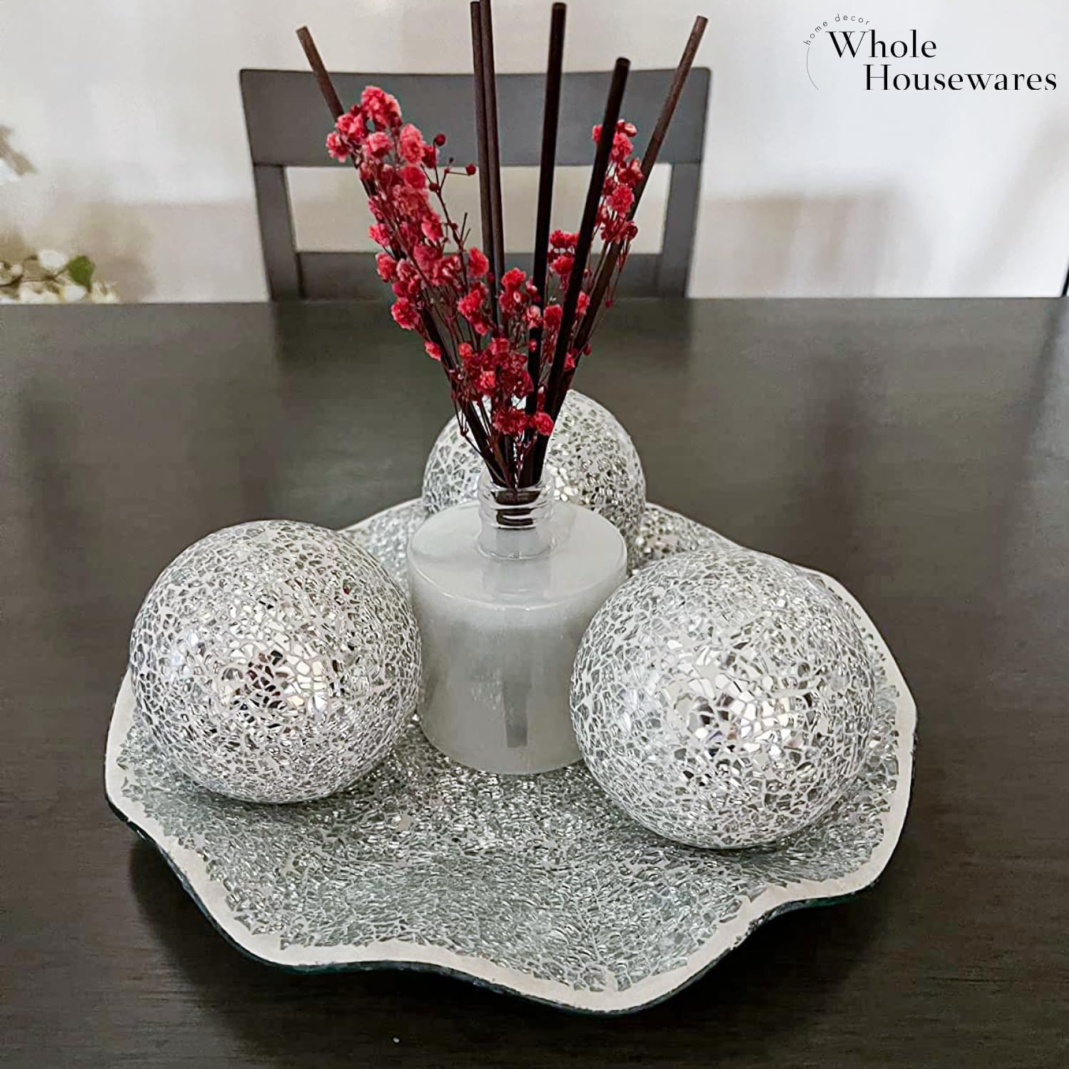 Design to Last – Add elegance to your kitchen, living room, office, and other living spaces with our sparkling mosaic glass set. It includes a decorative platter and three balls, all made of small pieces of crackle mosaic glass.