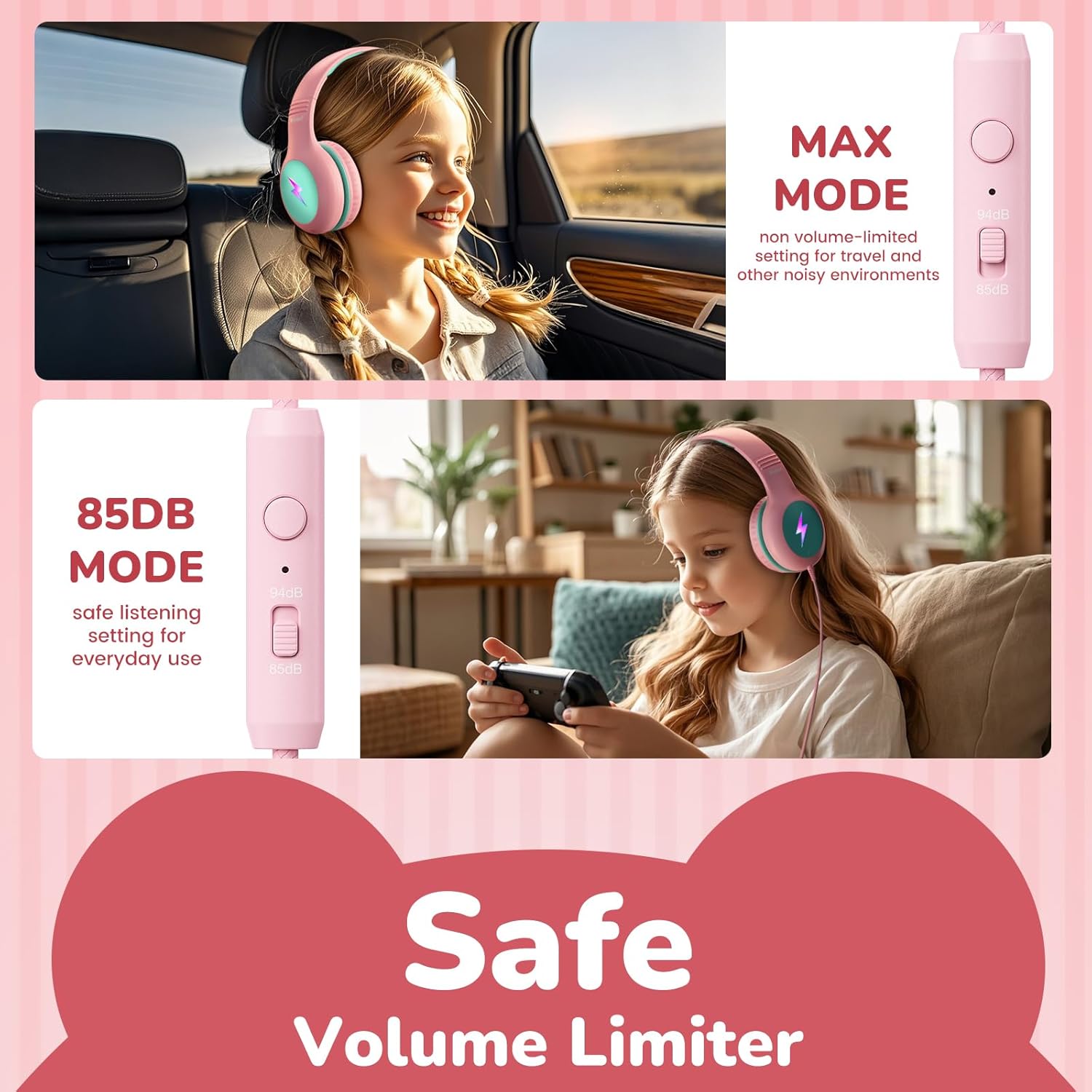 Safe Volume Limit & Hearing Protection: Safe Listening with Volume Limiter: These cute kids’ headphones feature a built-in volume limiter to keep sound levels below 85dB, which can protect your child’s hearing. A built-in switch allows the volume limiter to be disabled temporarily for use in noisy environments like travel.