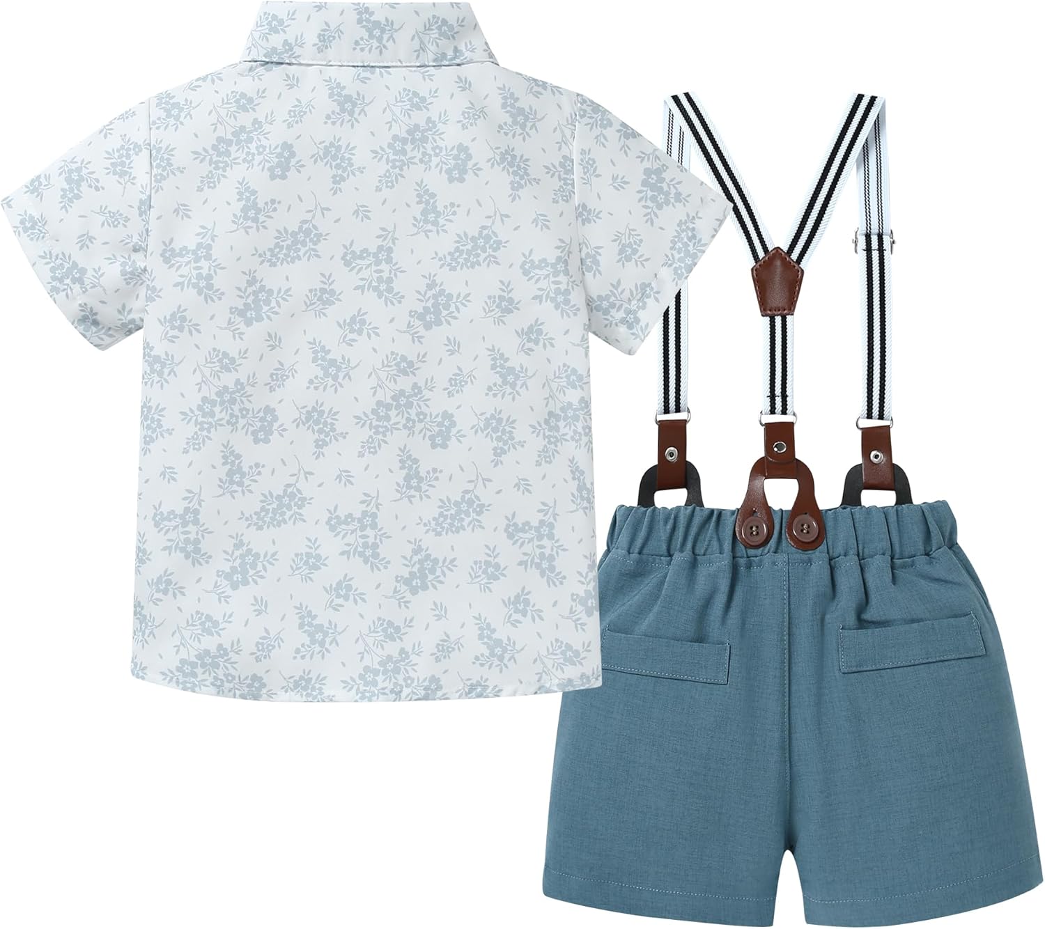 Handsome baby boys formal suit set, Solid color short-sleeved shirt with detachable tie + suspenders strap adjustable elastic braces shorts pants, great as toddler boy summer clothes set.