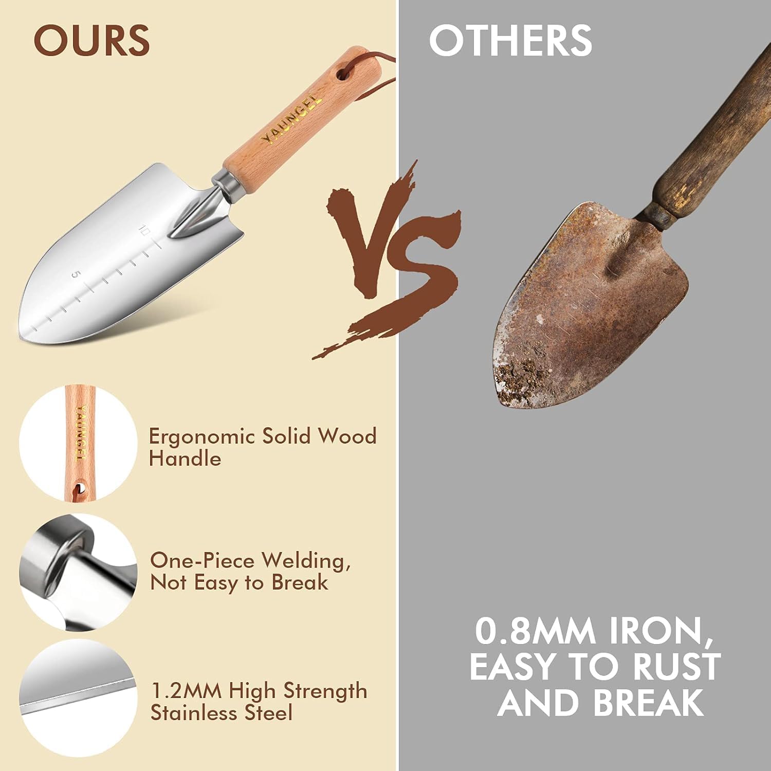 Durable Stainless Steel – Heavy-duty stainless steel heads can withstand the toughest roots, rocks, and soil, sturdier than cast aluminum/coated, No need to worry about rusting and breaking during pruning, digging, weeding, etc. Mirror-polished process to make the tool get the minimal soil adhesion and easier cleaning.